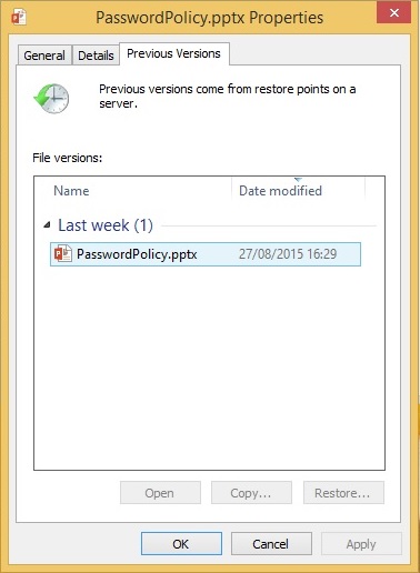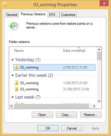 - Ga naar het tabblad "Vorige Versies" ("Previous Versions"). U ziet dan een lijst met de beschikbare vorige versies.